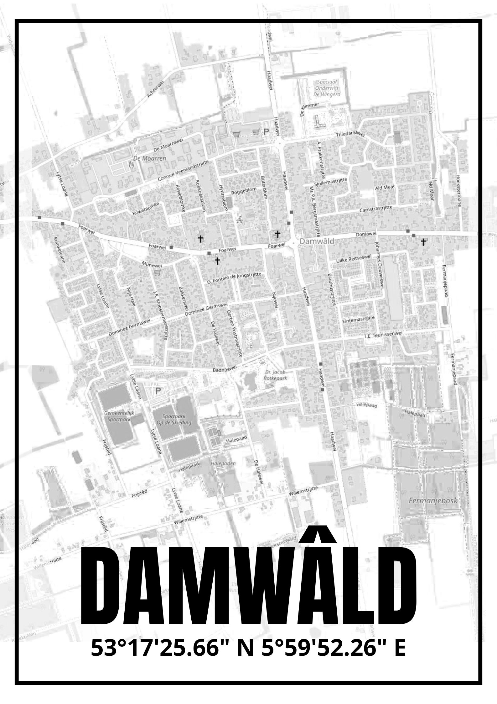Downloadbare plattegrond van Damwâld Met deze stijlvolle plattegrond van Damwâld haal je direct een uniek ontwerp in huis! Je ontvangt een digitale download die je zelf kunt uitprinten. Perfect om in te lijsten, cadeau te doen of je interieur een persoonlijke touch te geven.